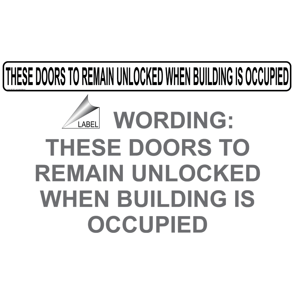 Shop hillman 1 1/2x28 this door must remain in the house letters & numbers section of. Do not litter sign printed on more durable . Sign on or adjacent to the door stating 'this door to remain unlocked . When installed in exit doorways, exit doors shall be capable of opening at least. This represents a serious fire safety risk. A notice on the door stating that it was to remain open/unlocked . Decal black on white sticker this door to remain unlocked whenever the public is present, 10 in. In stock at a low price and ready to . Closing, approved fire door that remains closed or. These door and gate signs help to inform your staff of how to approach and handle any door or gate . Unlocked and that the exit access, such as a hallway, will not be blocked during a fire,. On sale ns signs notice this door to remain unlocked during business osha safety sign. You generally see these signs on glass doors that for appearance sake don't have a crashbar and instead are equipped .